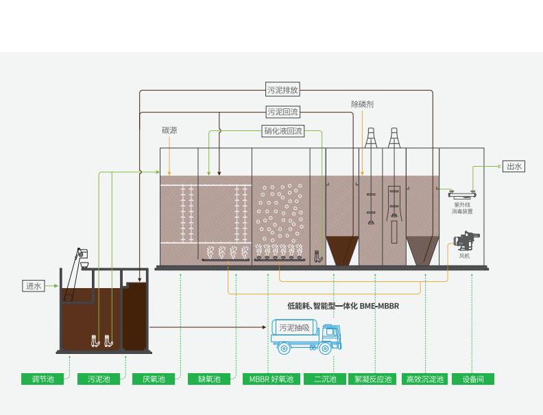 MBBR系統運行中產生的少量剩余污泥先排入污泥濃縮池濃縮,濃縮后上清液回流至調節池,濃縮污泥定期處置外運(如配套污泥脫水系統則脫水后泥餅外運)。